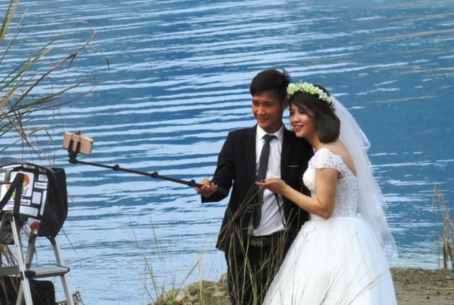 Lập gia đình đã lâu, nhưng hai vợ chồng trẻ đến từ Hải Phòng quyết định chụp lại ảnh cưới ở hồ nước xanh.