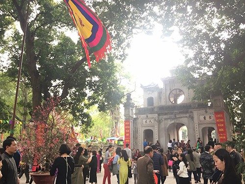 Ngoài các đền, chùa, Văn Miếu - Quốc Tử Giám cũng là điểm đến đông đúc vào những ngày này. Từ sáng sớm, hàng nghìn người xếp hàng mua vé để vào trong. Hầu hết khách là các bạn trẻ và gia đình có con nhỏ, đến cầu học hành, đỗ đạt. Sáng mùng 2 Tết tại đây diễn ra các màn tế lễ, nghệ thuật ngoài trời, thi đấu cờ bỏi, khai bút đầu năm... Ảnh: Di tích Văn Miếu - Quốc Tử Giám.