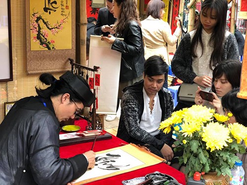 Khu vực hồ Văn là nơi thu hút đông khách nhất, với 63 gian hàng để các ông đồ cho chữ. Phố ông đồ ở đây sẽ được mở cửa đến hết ngày 25/2 (tức mùng 10 Tết), từ 8h đến 20h hàng ngày. Riêng các ngày mùng 1, 2, 3 Tết sẽ kéo dài đến 22h. Ảnh: Di tích Văn Miếu - Quốc Tử Giám.