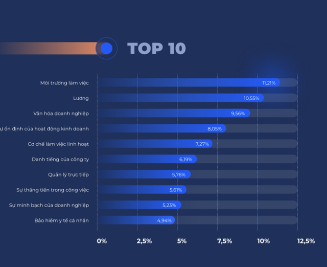 Người lao động ngày nay quan tâm rất nhiều đến những yếu tố về môi trường và văn hóa doanh nghiệp. Cụ thể, đa số người tham gia khảo sát lựa chọn Môi trường làm việc, Lương, và Văn hóa doanh nghiệp là 3 yếu tố hàng đầu giữ chân người lao động làm việc ở công ty hiện tại với tỷ lệ lần lượt là 11.21%, 10.55%, 9.56%. Sự ổn định của hoạt động kinh doanh xếp vị trí thứ 4 trong danh sách với tỉ lệ 8.05%. Cơ chế làm việc linh hoạt chiếm 7.27%.