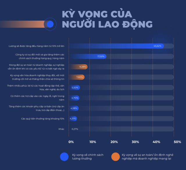 Bên cạnh các kỳ vọng về lương, thưởng và phúc lợi, người lao động cũng đặt thêm nhiều kỳ vọng khác vào doanh nghiệp. Điển hình như việc họ "Mong đợi sự an toàn từ doanh nghiệp, sự nghiệp vẫn ổn định khi có các yếu tố/ rủi ro bất ngờ xảy ra" và "Kỳ vọng văn hóa doanh nghiệp thay đổi, với môi trường cởi mở và thẳng thắn chia sẻ thông tin".