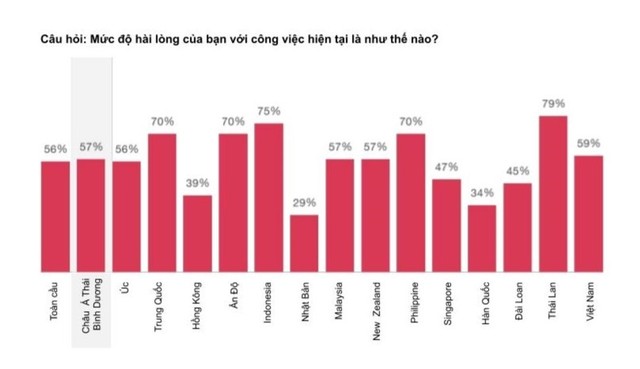 Các nền kinh tế phát triển như Nhật Bản, Hàn Quốc, Hồng Kông và Đài Loan (Trung Quốc) cho thấy mức độ hài lòng trong công việc thấp hơn, với tỷ lệ dao động từ 29 - 45%. Trong khi đó, người lao động ở Thái Lan, Indonesia, Philippines, Trung Quốc và Ấn Độ thể hiện mức độ hài lòng với công việc cao hơn, từ 70 - 79%.