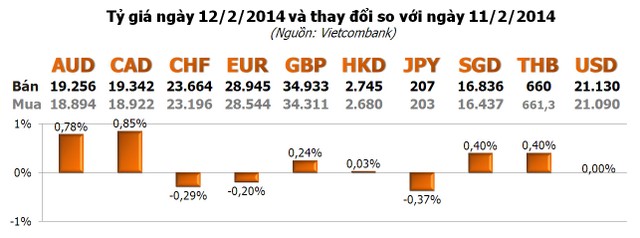 Với các ngoại tệ khác, xu hướng tăng vẫn là chủ đạo. Trong đó, CAD và AUD tăng tốc lên 0,85% và 0,78% cao hơn so với chiều qua. Tiếp theo là SGD và THB, cùng tăng 0,40%. Đồng JPY giảm trở lại với mức giảm so với chiều qua là -0,37%; tiếp theo là CHF với -0,29%...