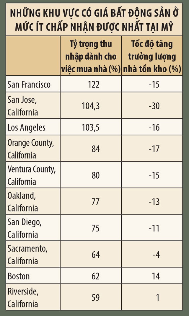 Tuy nhiên, đây mới là con số trung bình tại toàn nước Mỹ. Tại một số khu vực như San Francisco, San Jose (California), Los Angeles…, con số này lần lượt là 122%, 104,3% và 103,5%, cao nhất trong cả nước. Đồng thời, đây cũng là những khu vực có lượng hàng dự trữ dành cho người mua nhà giảm đáng kể, với tốc độ tăng trưởng lần lượt là -15%, -30% và -16%.
