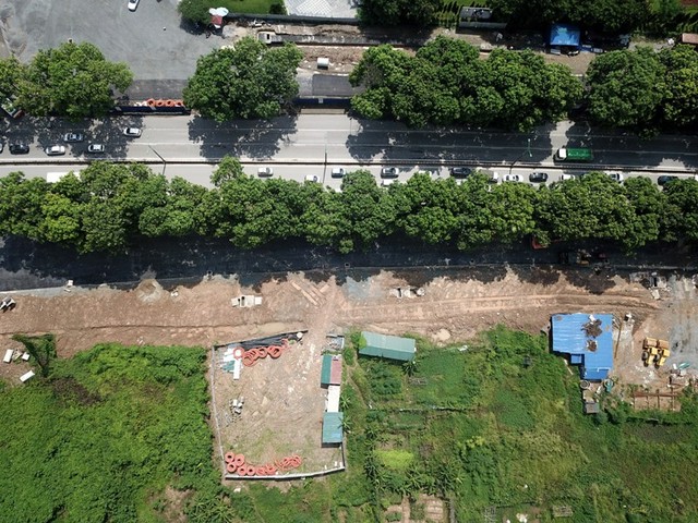 Công trường đang trong quá trình thi công với một bên đường ngôn ngang đất đá, vật liệu.