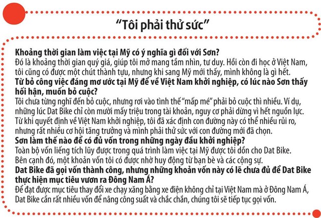 “Tôi tin, khi có sự lựa chọn, thì người tiêu dùng sẽ chọn xe chạy điện thay vì xe chạy xăng. Tuy nhiên, do các loại xe máy điện trên thị trường hiện nay có công suất và quãng đường di chuyển thực tế thấp (50 km/lần sạc pin), nên thật khó để người dân đưa ra quyết định chuyển đổi. Xe điện Dat Bike xuất hiện để giải tỏa những hạn chế của các dòng xe điện cùng phân khúc”, Nguyễn Bá Cảnh Sơn tự tin chia sẻ về dự án khởi nghiệp của mình.
