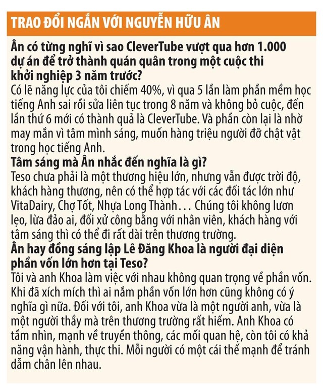 Dù ở vai trò nhà sáng lập ứng dụng học tiếng Anh CleverTube hay công ty cung cấp giải pháp chuyển đổi số Teso, Nguyễn Hữu Ân luôn tâm niệm điều này.