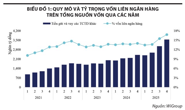 Đặc tính của vốn liên ngân hàng là linh hoạt, nhưng chính vì linh hoạt nên chi phí của nó cũng nhạy cảm với biến động lãi suất ngắn hạn hơn rất nhiều so với tiền gửi truyền thống. Khi một ngân hàng dùng nhiều hơn nguồn vốn này để lấp khoảng trống thanh khoản, lợi thế là có thể xử lý nhu cầu vốn rất nhanh, nhưng đổi lại, bảng cân đối sẽ trở nên nhạy cảm hơn với biến động lãi suất ngắn hạn và các tín hiệu điều hành từ Ngân hàng Nhà nước. Trong bối cảnh lãi suất thị trường quốc tế biến động lớn trong những năm qua khiến chính sách tiền tệ của Việt Nam bị ảnh hưởng rất nhiều, từ đó khiến cho biến động của nguồn vốn và lãi suất trên thị trường liên ngân hàng càng lớn. Chỉ cần lãi suất liên ngân hàng tăng mạnh trong một giai đoạn ngắn, nhóm ngân hàng có tỷ trọng nguồn vốn này cao sẽ hấp thụ áp lực ngay vào chi phí vốn. Bởi vậy, việc tỷ trọng vốn liên ngân hàng tăng không chỉ là câu chuyện quy mô, mà còn là câu chuyện về độ nhạy của toàn bộ hệ thống đối với chính sách tiền tệ.