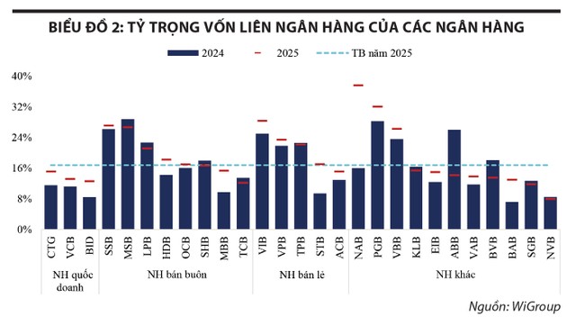 Sự phân hóa giữa các ngân hàng cũng nói lên khá nhiều điều về chiến lược vốn. Những ngân hàng có tỷ trọng vốn liên ngân hàng trong tổng nguồn vốn cao hơn mức bình quân cho thấy họ chấp nhận sử dụng kênh này mạnh hơn để xử lý nhu cầu thanh khoản trong các giai đoạn tăng trưởng tín dụng cao. Một số ngân hàng như SeABank, MSB, PGBank, ABBank hay VIB có tỷ trọng nguồn vốn từ thị trường liên ngân hàng cao hơn hẳn các ngân hàng còn lại. Những ngân hàng trong giai đoạn thuận lợi sẽ có thể tận dụng nguồn vốn giá rẻ để cải thiện NIM, tuy nhiên khi thị trường tiền tệ biến động thì cơ cấu vốn này cũng ảnh hưởng nhiều đến chi phí vốn của ngân hàng. Tỷ trọng nguồn vốn liên ngân hàng nhìn chung đều gia tăng trong năm 2025, cá biệt có các ngân hàng tăng tỷ trọng rất lớn như Nam A Bank, với mức gia tăng tỷ trọng gần như gấp đôi.