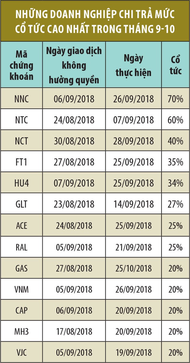Thống kê sơ bộ của Báo Đầu tư Chứng khoán, chỉ riêng trong tháng 9, có trên 70 doanh nghiệp thực hiện chi trả cổ tức bằng tiền mặt.