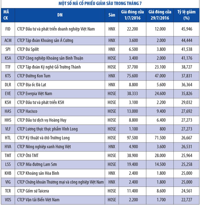 Nhiều cổ phiếu khác có mức giảm mạnh trong tháng 7 như HAX, TMT, HHS, HTL… Đây là những cổ phiếu đã tăng khá mạnh khi doanh nghiệp công bố kết quả kinh doanh quý I, nhưng sang quý II, do hiệu quả doanh nghiệp không mấy khả quan, khiến đà rơi của giá cổ phiếu cứ nối dài.