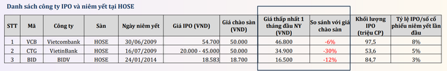 Ở giai đoạn thị trường phục hồi và ổn định sau khủng hoảng tài chính toàn cầu (2009 - 2015), nhiều cổ phiếu ngân hàng lớn như Vietcombank, VietinBank hay BIDV đều không tăng giá ngay khi niêm yết. Trong tháng đầu giao dịch, một số mã còn giảm từ 6% đến hơn 30% so với giá chào sàn (xem bảng dưới).