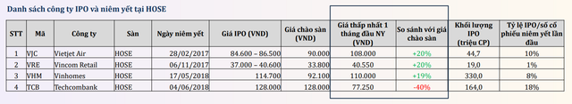 Ngược lại, giai đoạn 2016 - 2018 - khi VN-Index bước vào chu kỳ tăng trưởng mạnh và vượt mốc 1.000 điểm lại ghi nhận nhiều thương vụ IPO mà cổ phiếu khi lên sàn thì nhà đầu tư lại gặt hái được thành quả ngay trong ngắn hạn. Vietjet Air, Vincom Retail hay Vinhomes đều tăng khoảng 19 - 20% so với giá chào sàn chỉ trong tháng đầu tiên (xem bảng dưới).