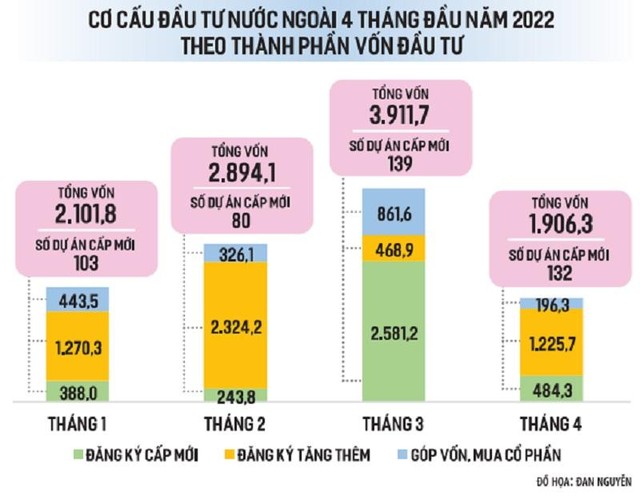 Trước đó, khi công bố số liệu thống kê về tình hình thu hút đầu tư nước ngoài, Cục Đầu tư nước ngoài cho biết, 4 tháng đầu năm, vốn đầu tư nước ngoài đăng ký vào Việt Nam đạt 10,8 tỷ USD, bằng 88,3% so với cùng kỳ năm 2021.