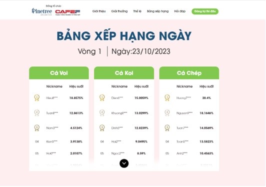 Chỉ sau 4 tuần thi đấu vòng 1, BTC đã chứng kiến những tài khoản tăng trưởng đáng kể và cũng có những sự rượt đuổi, thay đổi chóng mặt. Khi thị trường thuận lợi, bảng cá Koi với vốn đầu tư trung bình (từ 100 triệu tới 1 tỷ) có hiệu suất bỏ xa các bảng khác thì đến lúc thị trường gặp khó, bảng cá chép với vốn đầu tư nhỏ hơn (dưới 100 triệu) có thể cơ cấu danh mục dễ dàng hơn. Kết quả, bảng cá Chép hiện là bảng có tỷ suất lợi nhuận cao nhất, top 1 đạt 20.4%.
