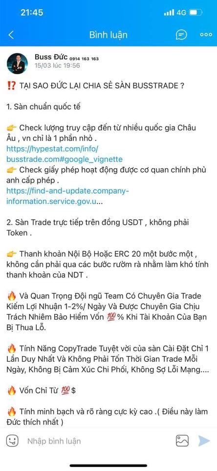 Theo tìm hiểu của PV, sàn Busstrade từng quảng cáo rầm rộ là sàn chuẩn quốc tế, có thể kiểm tra lượng truy cập đến từ nhiều quốc gia châu Âu và có giấy phép hoạt động do Chính phủ Anh cấp phép. Ngoài ra, còn có đội ngũ team có chuyên gia trade kiếm lợi nhuận 1-2%/ngày và được chuyên gia chịu trách nhiệm bảo hiểm vốn 100% khi tài khoản thua lỗ.