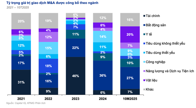 Hoạt động giao dịch M&A ghi nhận sự thay đổi đáng kể trong cơ cấu đóng góp theo ngành, với bất động sản (27%), vật liệu (20%) và y tế (10%), trở thành ba nhóm ngành đóng góp giá trị lớn nhất trong 10 tháng 2025.