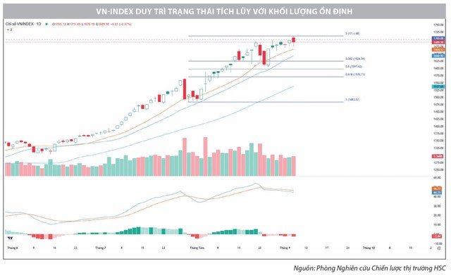 Với sự dịu lại của áp lực bán và tâm lý nhà đầu tư được cải thiện, VN-Index đang đứng trước cơ hội chinh phục mốc 1.700 điểm trong ngắn hạn. Tuy nhiên, lịch sử cho thấy, các giai đoạn chạm ngưỡng tâm lý quan trọng thường đi kèm rung lắc mạnh, đòi hỏi sự bền vững của dòng tiền tham gia. Trong các chu kỳ trước, thị trường thường trải qua nhịp điều chỉnh 8-10% để củng cố nền giá, từ đó hình thành xu hướng tăng mới. Do vậy, chúng tôi cho rằng, VN-Index có thể vượt mốc 1.700 điểm trong ngắn hạn, nhưng sự rung lắc mạnh là điều khó tránh.