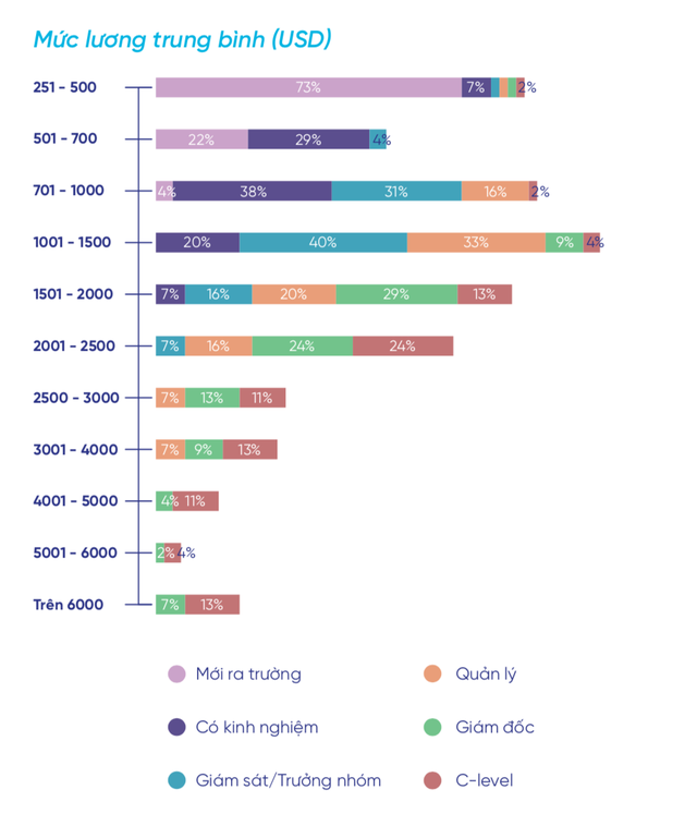 Khi so sánh theo mặt bằng lương chung (theo Báo cáo lương của VietnamWorks), nhà tuyển dụng cho thấy họ đang trả lương cho nhóm ứng viên có kinh nghiệm cao hơn một bậc so với nhiều ngành nghề khác với khoảng lương từ 701 - 1000 USD. So với các ngành nghề khác, mức lương phổ biến được trả cho nhóm ứng viên có kinh nghiệm là 251 - 500 hoặc 501 - 700 USD.