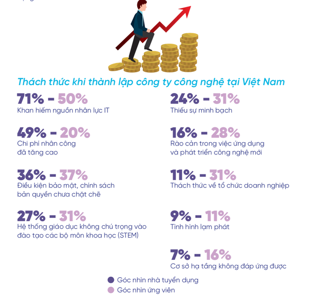 Trong đó, yếu tố Khan hiếm nguồn nhân lực IT; Điều kiện bảo mật, chính sách bản quyền chưa chặt chẽ; Hệ thống giáo dục không chú trọng vào đào tạo các bộ môn khoa học (STEM) và Thiếu sự minh bạch được sự đồng tình từ nhóm ứng viên. Mặc dù yếu tố Chi phí nhân công đã tăng cao được 1/2 nhà tuyển dụng cho là thách thức lớn nhưng nhóm ứng viên lại không nhận thấy điều này, chỉ có 20% ứng viên có cùng quan điểm.
