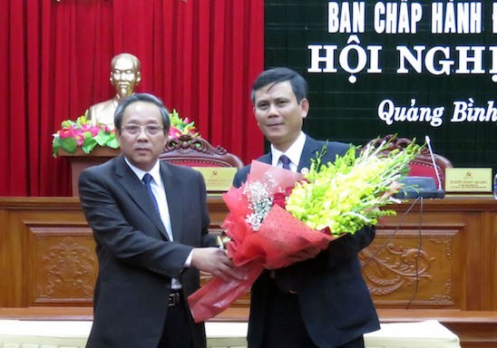 Bí thư Tỉnh ủy Quảng Bình Hoàng Đăng Quang chúc mừng đồng chí Trần Thắng.