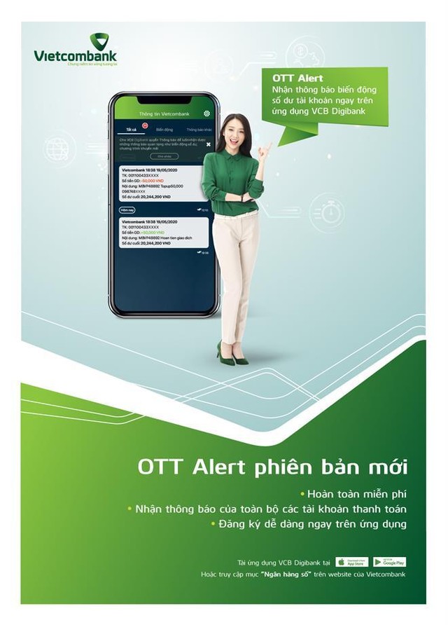 OTT Alert là tính năng thông báo biến động số dư tài khoản ngay trên ứng dụng (app) ngân hàng số VCB DigiBank với những ưu thế vượt trội bao gồm: Hoàn toàn miễn phí; Nhận thông báo xuyên biên giới, không phụ thuộc vào nhà mạng viễn thông; Nhận thông báo của toàn bộ các tài khoản thanh toán, thông báo chi tiêu thẻ, lịch trả nợ… Đăng ký ngay trên ứng dụng chỉ trong vài giây.
