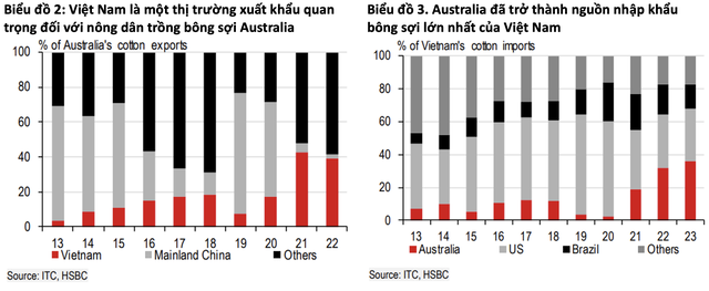 Việt Nam hiện đang là thị trường xuất khẩu bông sợi đơn lẻ lớn nhất của Australia, chiếm 40% tổng kim ngạch xuất khẩu bông sợi của nước này, gấp đôi thị phần năm 2020 (Biểu đồ 2). Tương tự, Australia chiếm gần 40% kim ngạch nhập khẩu bông sợi của Việt Nam.