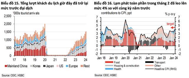 Trong khi đó, nhìn vào thị trường trong nước, tăng trưởng bán lẻ của hai tháng 1 và 2 đã hạ xuống 2,7% so với cùng kỳ năm trước do tăng trưởng tiêu dùng hàng hóa dịu lại. Mặc dù vậy, tình hình chi tiêu mạnh tay cho dịch vụ vẫn tiếp tục, trong đó du lịch nội địa mạnh mẽ với 10,5 triệu lượt khách trong giai đoạn nghỉ Tết. Du khách quốc tế cũng tiếp tục nối gót đà này, trong đó du khách Trung Quốc đại lục trở lại khoảng 60% mức của năm 2019, đưa tổng du khách lên ngang bằng với mức trước đại dịch.