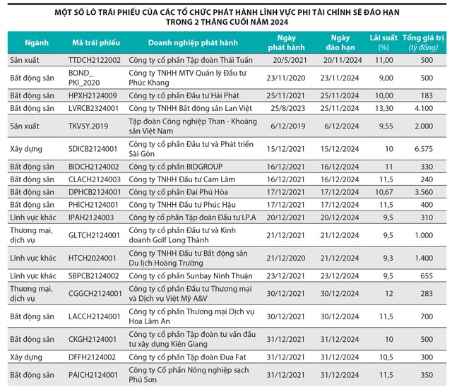 Theo Mirae Asset, có 30 trái phiếu dự kiến sẽ đáo hạn trong tháng 11/2024, với tổng giá trị đáo hạn khoảng 11.050 tỷ đồng, gồm 7.650 tỷ đồng trái phiếu lĩnh vực bất động sản, 1.700 tỷ đồng trái phiếu lĩnh vực sản xuất và gần 700 tỷ đồng trái phiếu ngân hàng thương mại.