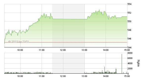 Trong buổi giao dịch chiều, sau ít phút thăm dò đầu phiên, cả 2 chỉ số chính đã dần dần nới rộng đà tăng. VN-Index lấy lại được mốc 550 điểm, trong khi HNX-Index cũng vượt qua được 82 điểm vừa để mất trong phiên trước. Đóng cửa, VN-Index tăng 1,09% lên 551,13 điểm, HNX-Index tăng 0,84% lên 82,27 điểm.