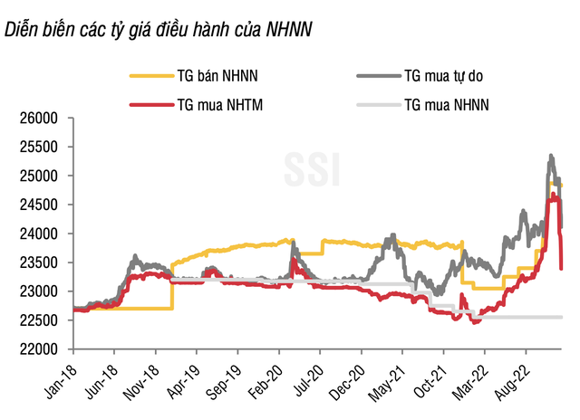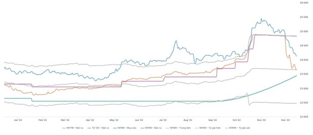 Trong đó, tính đến ngày 9/12, tỷ giá niêm yết đã giảm tới 2,2% trong vòng 1 tuần và hơn 6% trong vòng 2 tuần, hiện chỉ còn tăng 3,4% so với cuối năm 2021. NHNN điều chỉnh hạ tỷ giá bán tại Sở Giao dịch NHNN với mức điều chỉnh khiêm tốn, về 24.830 VND/USD.