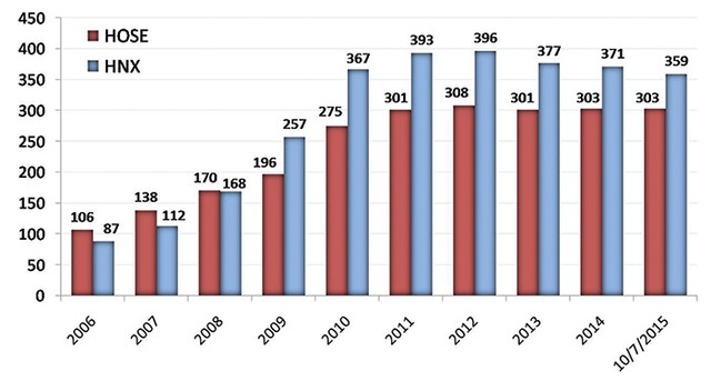 Số lượng doanh nghiệp niêm yết trên 2 sàn qua các năm