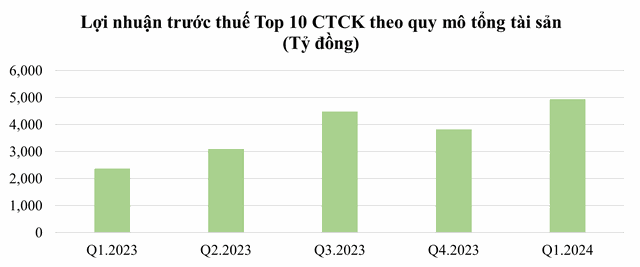 Trong quý I/2024, lợi nhuận trước thuế của tốp 10 công ty chứng khoán theo quy mô tổng tài sản tăng trưởng gần 30% so với quý trước đó và cao hơn gấp đôi so với cùng kỳ năm 2023, trở thành quý có lợi nhuận cao nhất trong gần 2 năm trở lại đây. Quy mô dư nợ cho vay toàn ngành cũng đã lập đỉnh mới, ước đạt hơn 205.000 tỷ đồng tại thời điểm cuối quý I/2024.