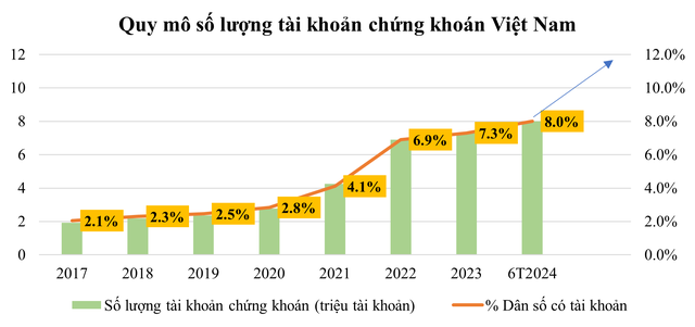 Ở Việt Nam, số tài khoản chứng khoán đang tăng nhanh, nhưng hiện mới đạt khoảng gần 8% dân số, thấp hơn nhiều so với mức bình quân 25 - 30% tại các thị trường phát triển.