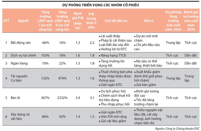 Dự báo về nhóm cổ phiếu có khả năng dẫn dắt thị trường thời gian tới, ông Đinh Quang Hinh cho rằng, ngân hàng sẽ thu hút dòng tiền và dẫn dắt thị trường nhờ nhu cầu tín dụng tăng cao dịp cuối năm và hưởng lợi từ việc “nới lỏng chính sách” của Ngân hàng Nhà nước như đã đề cập ở phần trên. Song hành với nhóm ngành ngân hàng là nhóm bất động sản nhà ở, đặc biệt là những doanh nghiệp có nguồn đất sạch, tiềm lực tài chính lành mạnh sẽ được hưởng lợi từ xu hướng phục hồi của thị trường bất động sản sau khi ba sắc luật liên quan đến thị trường bất động sản có hiệu lực.