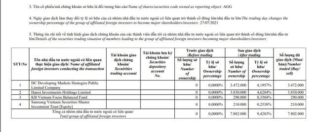 Theo công bố thông tin, xác nhận đây là giao dịch của nhóm quỹ Dragon Capital (bao gồm DC Developing Markets Strategies Public Limited Company, Hanoi Investments Holdings Limited, KB Vietnam Focus Balanced Fund, Samsung Vietnam Securities Master Investment Trust Equity).