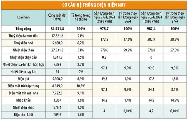 Tuy nhiên, đi vào chi tiết, có thể thấy rõ áp lực tăng mạnh trong giai đoạn nắng nóng. Cụ thể, ngày 26/4, sản lượng ngày của hệ thống điện quốc gia đã tăng 23,1%, sản lượng hệ thống điện miền Bắc tăng 35,5% so với cùng kỳ năm 2023. Còn ngày 27/4, công suất cực đại hệ thống điện quốc gia tăng 20,2%, riêng công suất cực đại của hệ thống điện miền Bắc tăng 19,9%.