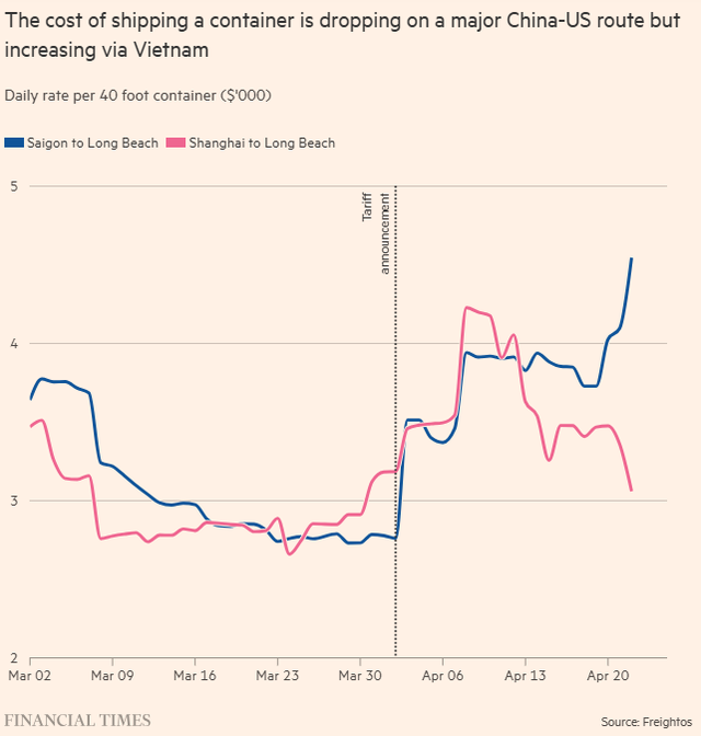 “Giá cước từ các nước châu Á khác đến Mỹ có thể tiếp tục tăng trước thời hạn áp thuế vào tháng 7”, Judah Levine, Giám đốc nghiên cứu tại Freightos cho biết.