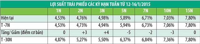 Trong tuần từ 19/1 - 23/1/2015, nhu cầu trái phiếu của các NĐT tiếp tục ở mức cao với khối lượng đăng ký thầu cao gấp 2,24 lần khối lượng gọi thầu. Trong đó, Kho bạc Nhà nước phát hành 6.000 tỷ đồng trái phiếu kỳ hạn 5 năm tại mức lợi suất trúng thầu 5,9%/năm, giảm tới 11 điểm cơ bản so với tuần trước. Tỷ lệ trúng thầu đạt 100%.