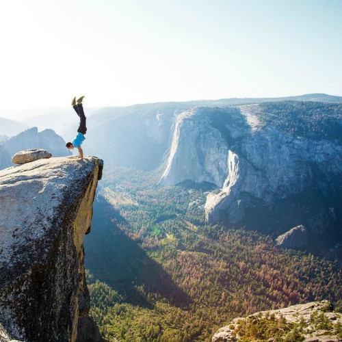 Chàng trai này còn mạo hiểm đứng tư thế "trồng cây chuối" ở mỏm Taft Point ở công viên quốc gia Yosemite (Mỹ).