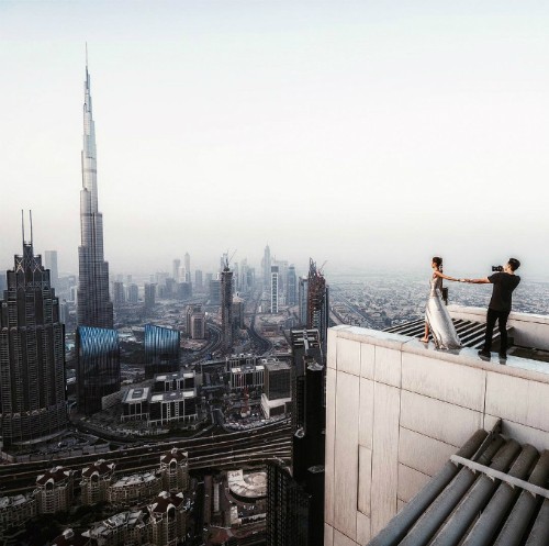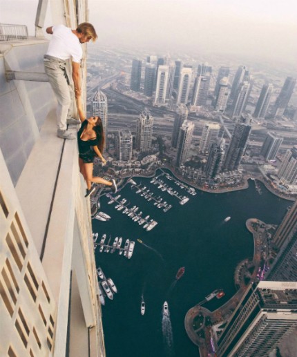 Cặp đôi "Nắm tay nhau đi khắp thế gian" Murad Osmann và Nataly Osmann cũng từng thử sức ở toà nhà cao tầng tại Las Vegas, Mỹ khi Nataly ngồi chênh vênh ở mép nhà, tay còn lại nắm tay Murad.