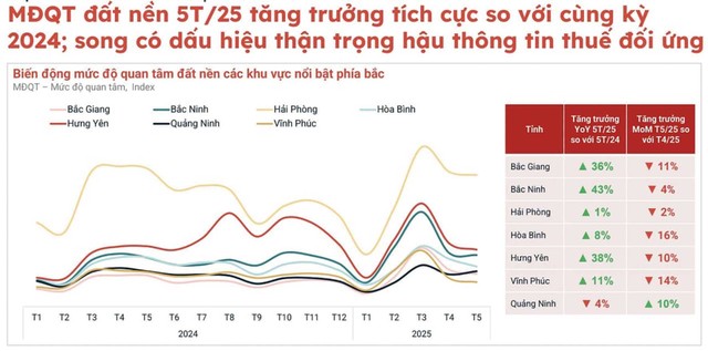 Dữ liệu của Batdongsan.com.vn cũng cho thấy, mức độ quan tâm đất nền tại Hà Nội và các tỉnh phía Bắc có xu hướng giảm tốc sau khi đạt đỉnh vào tháng 3/2025, với mức giảm tương ứng là 15% và 5% theo tháng.