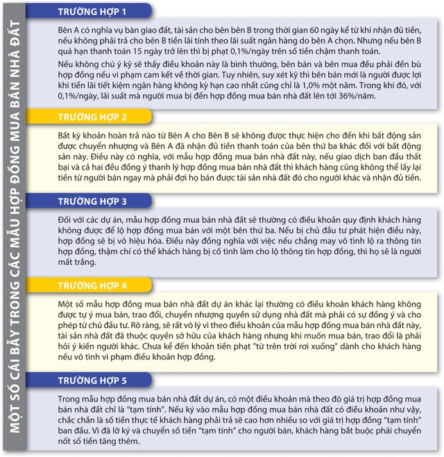 Ở góc độ khác, theo Thạc sỹ Nguyễn Tấn Hoàng Hải, Giảng viên Khoa luật Dân sự - Trường đại học Luật TP.HCM, người mua khi đọc một hợp đồng quá dày thường có tâm lý chỉ chọn đọc những khoản mà mình quan tâm thông qua tên điều khoản. Nắm bắt được tâm lý này, các chủ đầu tư (không thực hiện đăng ký mẫu hợp đồng với cơ quan chức năng) có thể dễ dàng quy định thêm nhiều điều khoản về thời hạn bàn giao nhà có lợi cho mình.