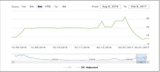 Cổ phiếu SIC của Công ty cổ phần Đầu tư - Phát triển Sông Đà cũng là một trường hợp như thế khi có liên tiếp 16 phiên giảm sàn (từ ngày 3/1/2017 đến hết 20/1/2017), rơi từ mức giá 33.000 đồng/cổ phiếu về 6.500 đồng/cổ phiếu. Đến nay, sau phiên giao dịch “cầm máu” ngày 25/1/2017, SIC đã có 5 phiên tăng trần, 2 phiên giảm giá, vươn lên mức 8.000 đồng/cổ phiếu.