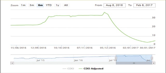 Ngày cuối năm 2016, khi cả thị trường đang tất bật chuẩn bị cho kỳ nghỉ Tết thì cơ quan quản lý vẫn phải tiến hành kiểm tra CDO, sau sự kiện cổ phiếu này giảm sàn liên tiếp từ mức giá 37.200 đồng/cổ phiếu ngày 30/11/2016.