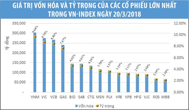 Tuy nhiên, khác với 11 năm trước, trong sóng tăng từ cuối năm 2017 đến đầu năm 2018, dù chỉ số chứng khoán tăng mạnh, nhưng dòng tiền đa phần tập trung vào các cổ phiếu vốn hóa lớn. Nếu như VNM, VIC, VCB, GAS, SAB… liên tục tăng giá và có hệ số giá trên thu nhập mỗi cổ phần (P/E) tăng vọt, tạo khoảng cách lớn với thị trường chung, thì khoảng một nửa số doanh nghiệp niêm yết bị lãng quên, giao dịch nhỏ giọt, cổ phiếu không tăng giá, thậm chí giảm mạnh.