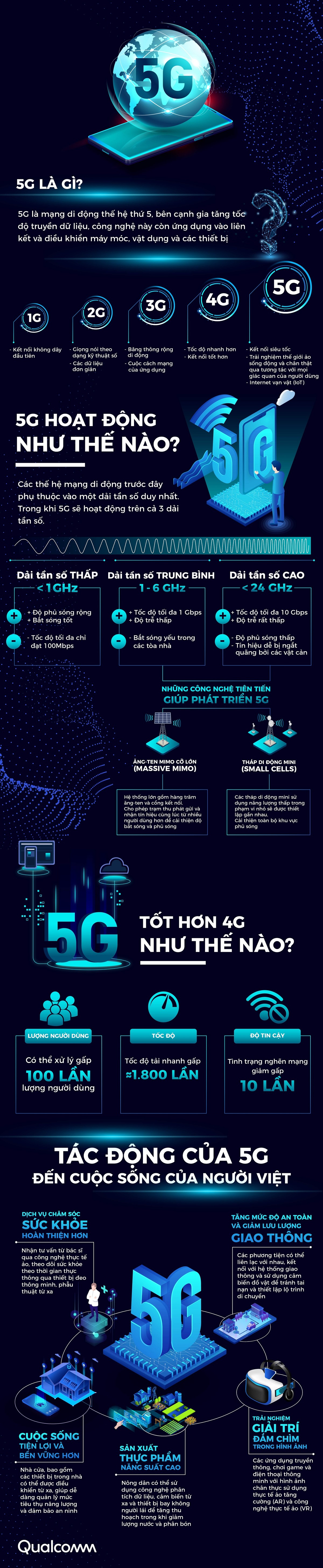 Mạng 5G hoạt động ở dải tần số cao, cho tốc độ tải nhanh gấp 1.800 lần so với 4G.