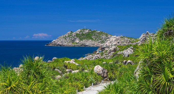 Cù Lao Xanh hay đảo Vân Phi nằm cách thành phố biển Quy Nhơn (Bình Định) khoảng 24 km. Đúng như tên gọi, hòn đảo nhỏ được cây cối bao phủ toàn bộ như một viên ngọc xanh giữa biển. Các bãi tắm ở đây còn hoang sơ, nước trong vắt, dải cát thoai thoải và bãi đá nhiều hình thù hình thành tự nhiên. Từ trung tâm xã, men theo con đường bê tông, du khách đi qua các dãy nhà nhỏ để khám phá cuộc sống của người dân nơi này. Điểm tham quan nổi tiếng nhất trên đảo là hải đăng Cù Lao Xanh, thuộc top 5 ngọn hải đăng trên 100 tuổi ở Việt Nam. Hình ảnh ngọn hải đăng cao 119 m do người Pháp xây dựng từng được chọn in trong bộ tem Hải đăng Việt Nam, phát hành năm 1992. Ảnh: Kiều Dương.
