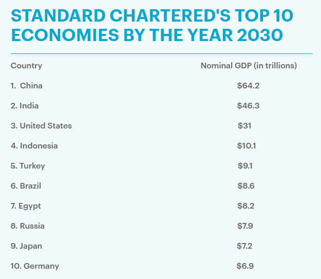 Bất ngờ hơn, theo bảng dự báo này, đại diện duy nhất của Đông Nam Á, Indonesia vượt qua các nền kinh tế châu Âu vươn lên vị trí thứ 4. Tiếp đó, trong top 10 do Standard Chartered dự đoán, lần lượt là Thổ Nhĩ Kỳ, Brazil, Ai Cập, Nga, Nhật, Đức.