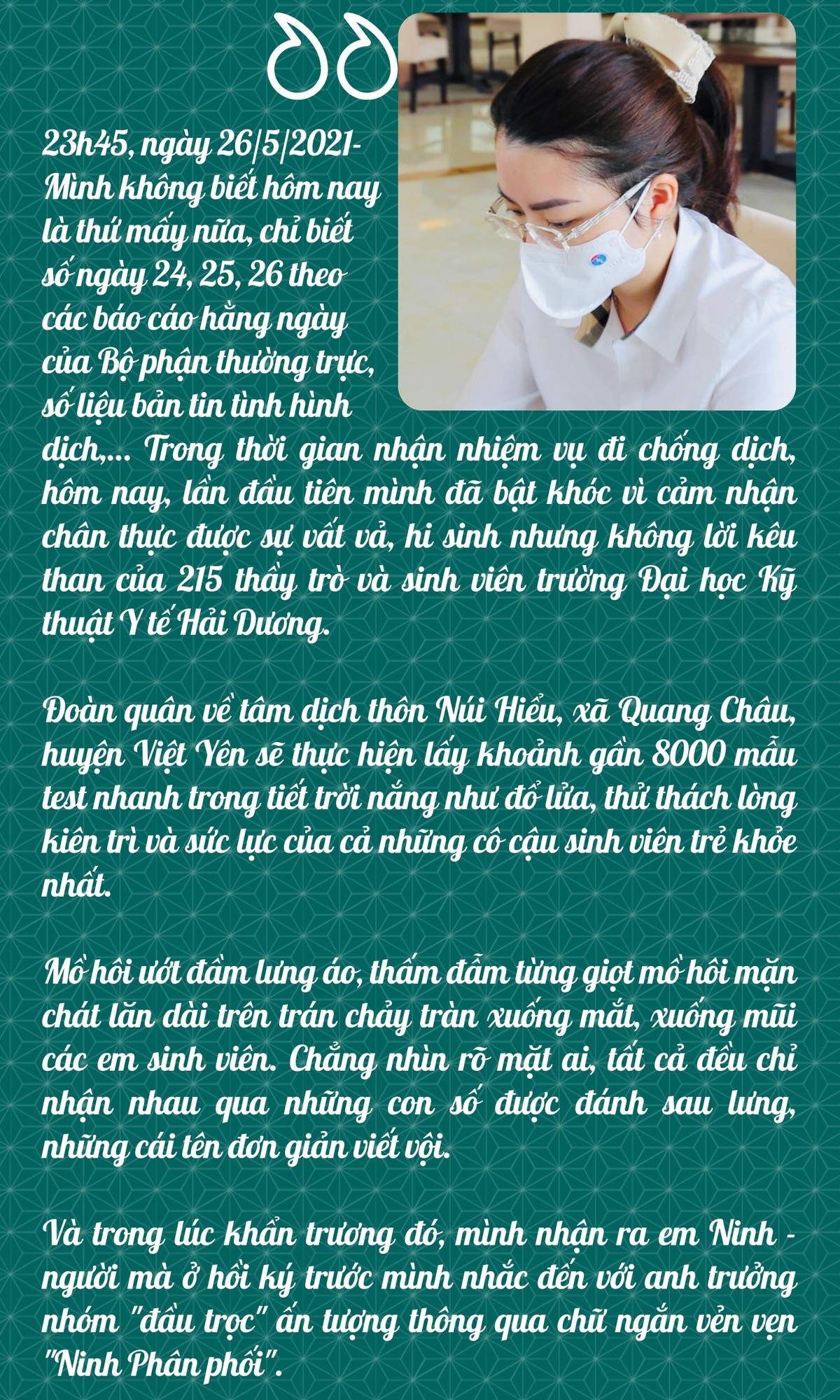 Tuy vậy sâu thẳm trong từng nhịp thở, từng câu chuyện, nữ cán bộ truyền thông hiểu rằng những con người đang trên “mặt trận” tuyến đầu chống Covid-19 họ không chỉ đang điều trị cho cơn ho, sốt, khó thở của người bệnh, họ điều trị cho một con người có tình cảm, có gia đình, có quê hương. Chính vì lí do đó, những y bác sĩ, nhân viên y tế đang ngày đêm chống dịch mới đủ sức mạnh và sự kiên cường để ngày đêm cố gắng.